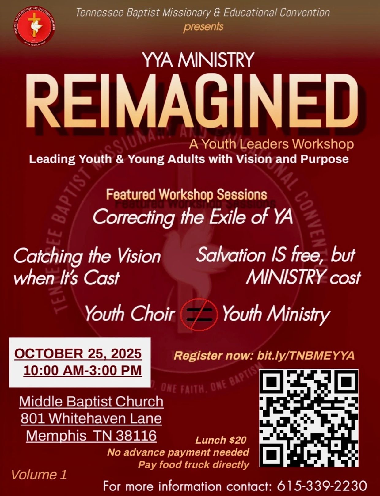 See attached flyer for event details. The event is open to all TNBME churches as well as non-TNBME churches. We would be honored to partner with you in developing leaders who will impact this generation and the next for Christ. Thank you for your continued commitment to raising up strong leaders in your congregation. We look forward to seeing your team at YYA Reimagined!
